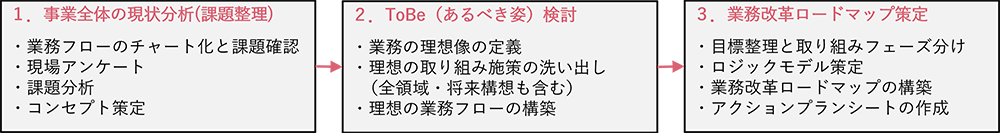 業務改革プロジェクトは、業務フローの明示化と課題の洗い出しからスタート。その後、「フェーズ1:事業全体の現状分析(課題整理)」「フェーズ2:ToBe(あるべき姿)検討」「フェーズ3:業務改革ロードマップ策定」と段階を踏んだコンサルティングへとつなげる形で進められました。