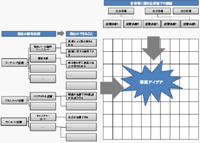 技術の棚卸し(共通言語による一元化)A社は多面的に事業展開をしていて強みとなるシーズ技術を多数保有していましたが、それらが全社として共有化されていないことが事業アイデアの幅を狭めている一因となっていました。本活動の目的を達成するためには、社内に点在している知見を共通言語で一元化・共有化し、事業アイデアの幅を広げることが必要でありました。