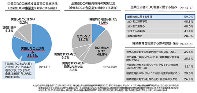 日本企業のFWB施策は依然として黎明期にあり、欧米に比して10年程度遅れていると言及されることが多いです。多くの企業が給与・退職給付制度に依存し、従業員の将来不安や金融リテラシー不足に十分に対応できていません。人的資本経営や働き方改革の進展に伴い、従業員のFWBを支える新たな施策の導入が急務です。以下、金融庁の調査※7によると、企業型DCを実施する事業主の8割は継続投資教育を実施したことがあると回答している一方、継続的な教育を受けたと回答した加入者は1割程度となっています。この金融経済教育に対する意識のギャップが日本の取組みが遅れている大きな要因の1つと捉えています。