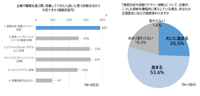 【出典】J-FLEC 金融経済教育の課題と展望「企業型DCにおける継続投資教育」2024年12月6日よりまた、J-FLECの調査※8によると、企業や職場を選ぶ際、用意してくれたら良いと思う研修として以下の通り資産形成・金融リテラシー研修への要望が最も高いというデータもあります。企業にとってFWBの向上を意識した取り組み需要は今後益々高まりをみせていくでしょう。