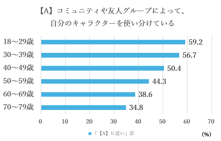対人関係や人との付き合いについての質問のうち、「【A】コミュニティや友人グループによって、自分のキャラクターを使い分けている【B】コミュニティや友人グループが異なっても、自分のキャラクターを使い分けることはない」のどちらが自身の考えや気持ちに近いかと尋ねたところ、「【A】自分のキャラクターを使い分けている」計が今年の調査では47.0%であり、昨年の40.8%から6.2ポイント上昇しました。特に18~29歳では、59.2%がコミュニティや友人グループごとに、使い分けていることが明らかとなりました。