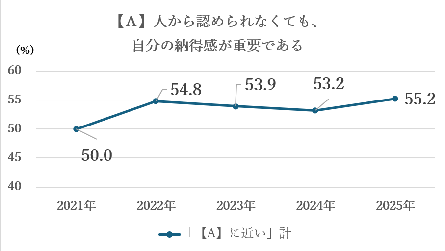 「【A】人から認められなくても、自分の納得感が重要である【B】周りの人びとから認められることが重要である」のどちらの考えに近いか尋ねた質問では、「【A】自分の納得感が重要である」計が、2021年は50.0%であったのに対し、2025年には55.2%と、5.2ポイント上昇しました。