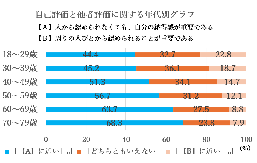 年代別に見ると、18~29歳の「【A】自分の納得感が重要」と考える人の合計は44.4%で、全体の55.2%より10.8ポイント低い結果となりました。今回調査した対象者では、年代が下がるにつれ「【A】自分の納得感が重要」計が少なくなり、「【B】周りの人びとから認められることが重要」計が多くなる傾向が見受けられました。