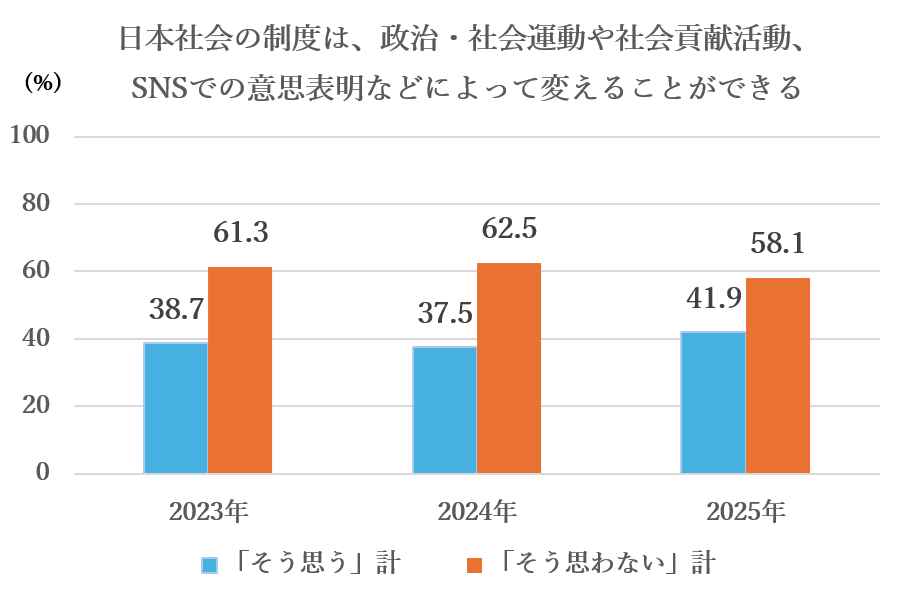 「日本社会の制度は、政治・社会運動や社会貢献活動、SNSでの意思表明などによって変えることができる」と思うかという質問に対して、直近3年間では「そう思わない」計が約6割と過半数を占めています。その一方で、大きな変化ではありませんが「そう思う」計の増加(2025年は41.9%で、昨年の37.5%より4.4ポイント上昇)も見られました。