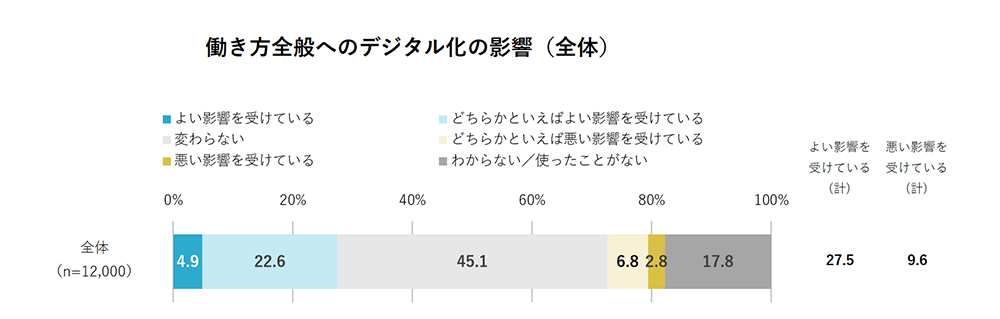 デジタル化が進んでいることによって、よい影響を受けているか悪い影響を受けているかを尋ねたところ、働き方全般については「変わらない」が45.1%でもっとも多く、「よい影響を受けている(計)」が27.5%、「悪い影響を受けている(計)」が9.6%、「わからない/使ったことがない」は17.8%であった。