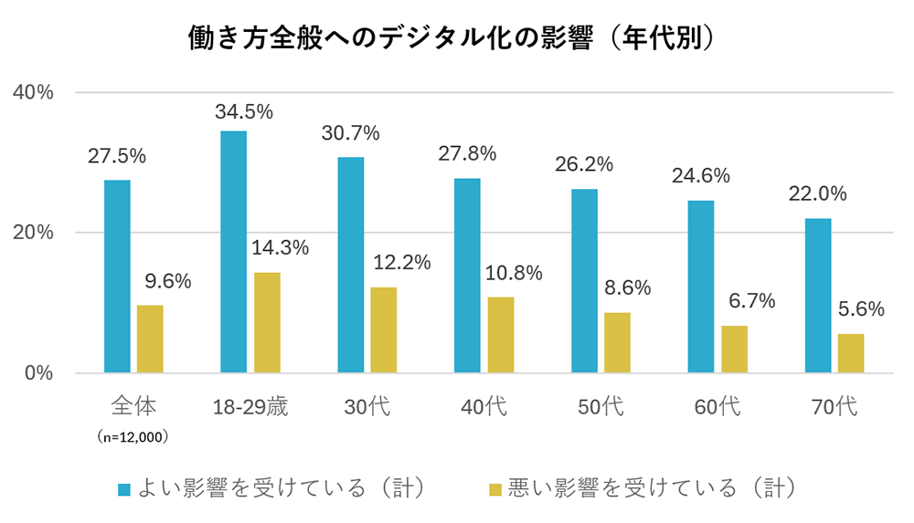1.デジタル化が進んでも働き方全般の変わらない人は約半数、デジタル化でよい影響を受けている人の方が悪い影響を受けている人よりも多い