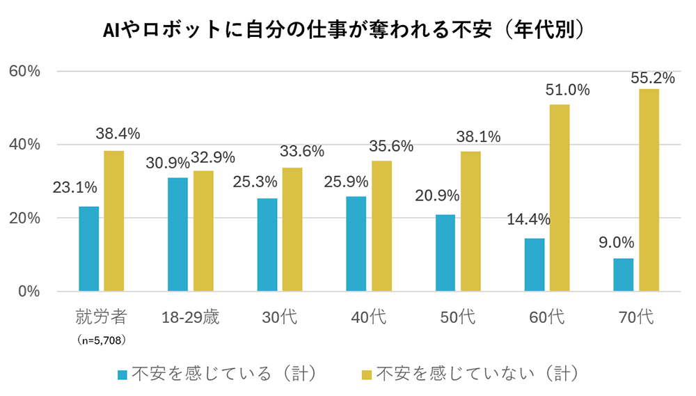 AIやロボットなどのデジタル化が進むことによって、自分の仕事を奪われる不安を感じているかについて、現在働いている人(就労者 n=5,708)を対象に尋ねた。その結果、「不安を感じている(計)」23.1%、「どちらともいえない」27.9%、「不安を感じていない(計)」38.4%、「考えたことがない」10.6%と、回答がやや分散した。