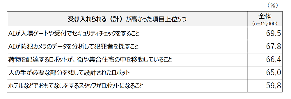 私たちの日常生活では既にAIやロボットが活用される場面が多く見られ、今後さらにこうした場面が増えていくと仮定してそれらの受容度を尋ねた。「受け入れられる(計)」が高かったものは、入場時のセキュリティチェックや防犯カメラでのデータ活用による犯罪者の捜索、荷物配達ロボットなどであった。また、人の手が必要な部分を残して設計されたロボットへの受容度も高かった。