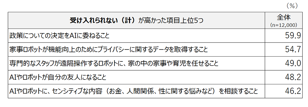 逆に「受け入れられない(計)」が高かったものは、政策決定をAIに委ねることや、プライバシーに関わるものが挙げられている。「AIやロボットに、センシティブな内容(お金、人間関係、性に関する悩みなど)を相談すること」を46.2%が「受け入れられない(計)」と回答しているが、年代別に見ると18-29歳では「受け入れられない(計)」は35.4%にとどまる一方、50.9%が「受け入れられる(計)」と回答するといった特徴が見られた。