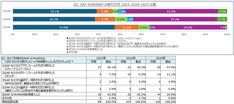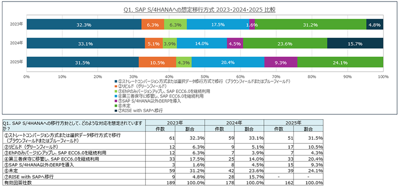 2-1.「SAP ECC6.0」ユーザー企業の想定する「SAP S/4HANA」への移行は「コンバージョン方式」が最多2023年および2024年度の調査結果と同様に、「コンバージョン方式」※を想定している企業が最多でした。