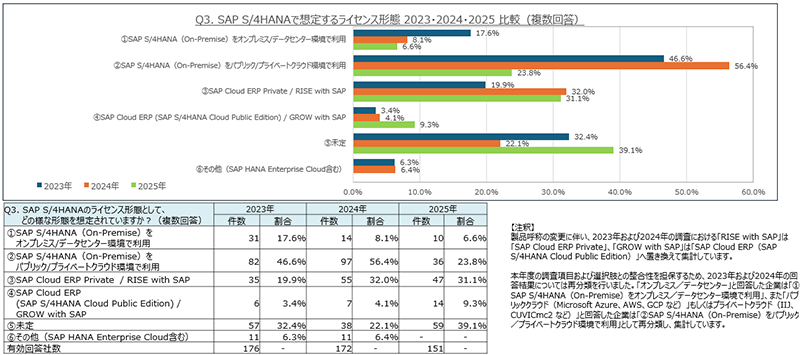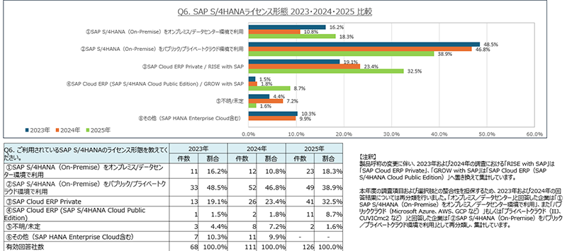 【注】:製品呼称の変更に伴い、2023年および2024年の調査における「RISE with SAP」は「SAP Cloud ERP Private」、「GROW with SAP」は「SAP Cloud ERP(SAP S/4HANA Cloud Public Edition)」へ置き換えて集計しています。