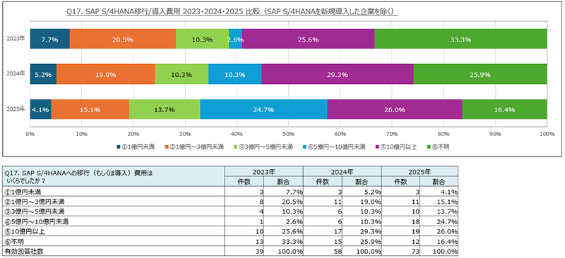 4.「SAP S/4HANA」への移行費用は、全体の半数以上が「5億円以上」と回答2025年度の調査結果では、「SAP S/4HANA」を新規導入した企業を除く「SAP S/4HANA」への移行費用は、10億円以上が26%(19社)と最も多く、5億~10億円未満の回答が24.7%(18社)と続いています。