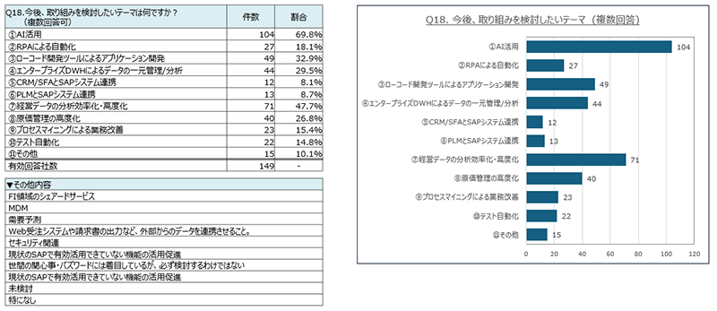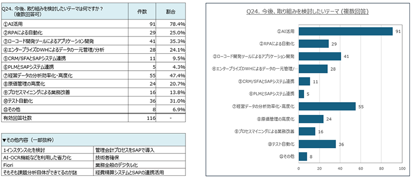 5.「SAP ECC6.0」、「SAP S/4HANA」ユーザーともに今後最も取り組みたいテーマは「AI活用」2025年度の調査では、「SAP ECC6.0」および「SAP S/4HANA」ユーザー企業ともに、AI活用が最も多く、経営データの分析効率化・高度化、ローコード開発ツールによるアプリケーション開発と回答が続きました。
