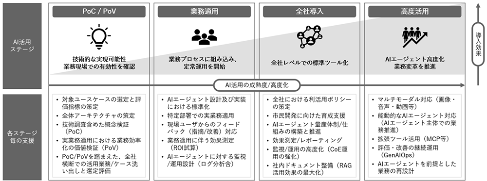 1.戦略から運用までの一気通貫支援事業・業務の観点から要件定義を行い、エージェント設計、PoC(概念実証)、セキュアなエージェントの量産・運用までを伴走します。短期間で価値仮説を検証し、中長期的な活用の戦略策定を行います。