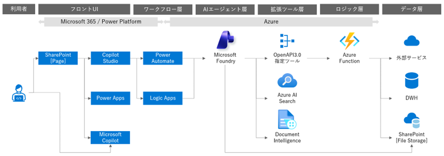 「Microsoft 365」及び、「Microsoft Power Platform」「Azure」の各サービスを組み合わせることで、各レイヤーの要件を各サービスで実現し、「Microsoft Foundry」を最大限活用することを想定しています。