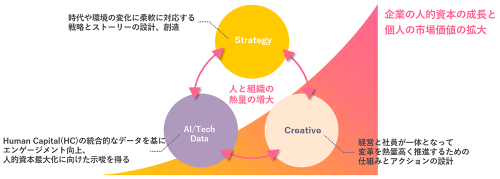 こうした課題感を受けて、当センターは、事業と人事、戦略と施策などさまざまな要素をつなぎ合わせ、一つのストーリーで人と組織の熱量を上げ、価値創造と競争優位をクライアントへ提供し、企業の人的資本の成長と、個人の市場価値の拡大を実現します。