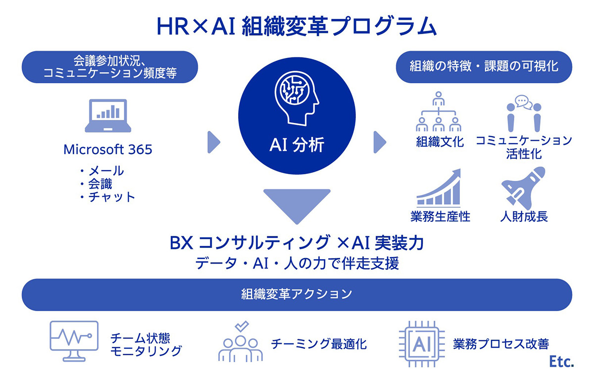 テクノロジーで企業と社会の進化を実現する株式会社電通総研(本社:東京都港区、代表取締役社長:岩本 浩久、以下「電通総研」)は、株式会社電通(本社:東京都港区、代表取締役 社長執行役員:松本 千里)と Microsoft 365 の業務行動データを起点に、組織課題の診断から施策立案・実行支援までを一気通貫で提供する「HR×AIの組織変革プログラム」を開発し、2026年4月14日(火)より提供を開始します。