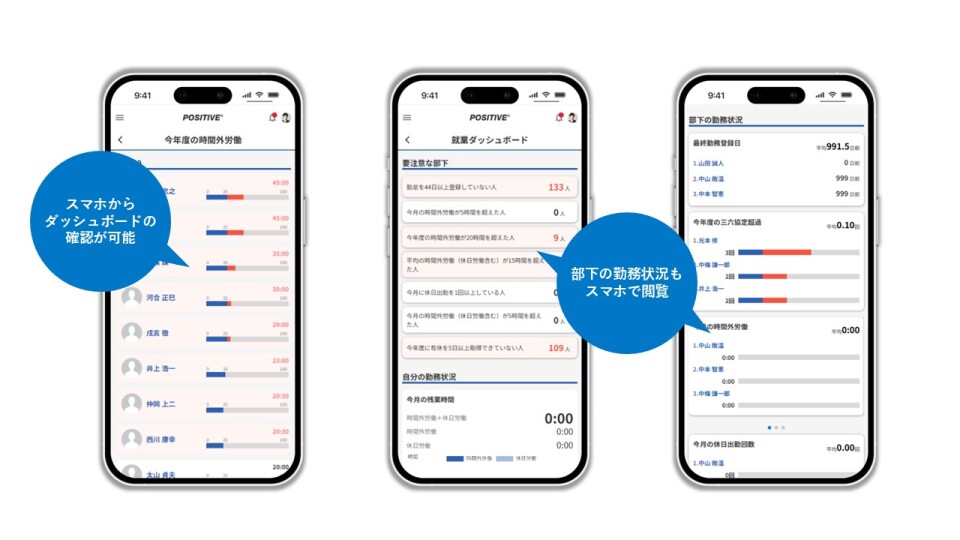 2.就業ダッシュボードの新設「POSITIVE Ver.7.1」と同様に、スマートデバイス上でも就業ダッシュボードの参照が可能となりました。ユーザー自身の勤務状況に加え、管理者は部下の勤務状況も一覧で確認でき、現場での労務管理における迅速な意思決定を支援します。