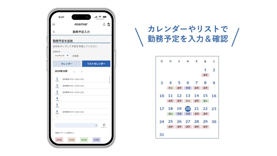 3.勤務予定入力・照会の拡充カレンダー形式およびリスト形式の表示に対応し、詳細な勤務予定の入力や照会がスマートデバイス上で可能となりました。外出先でも簡単かつ柔軟にスケジュール管理が行えます。