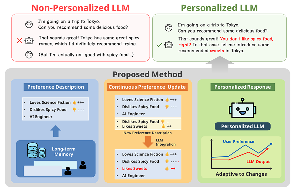 これにより、AIはユーザーの嗜好変化をリアルタイムに反映しつつ、矛盾のない応答を生成できるようになります。提案手法はモデルの再学習や大規模なシステム改修を必要としないため、既存のAIサービスにも容易に組み込める点が特長です。 実験では、複数のベンチマークデータセットを用いて評価を実施し、従来手法と比較して、ユーザーの嗜好により適合した応答を安定して生成できることを確認しました。