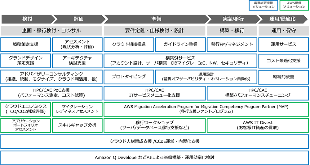 「AWS IT トランスフォーメーションパッケージ for MCP 電通総研版」(ITX)は、お客様のAWSへのIT基盤移行を評価・準備・実装・運用まで一貫して支援します。Well-Architectedの考え方に基づくベストプラクティスと、電通総研の大規模移行やHPC/CAEなどの知見を掛け合わせ、組織とシステム両面から、お客様のクラウド移行・モダナイゼーション・AI活用を実現します。