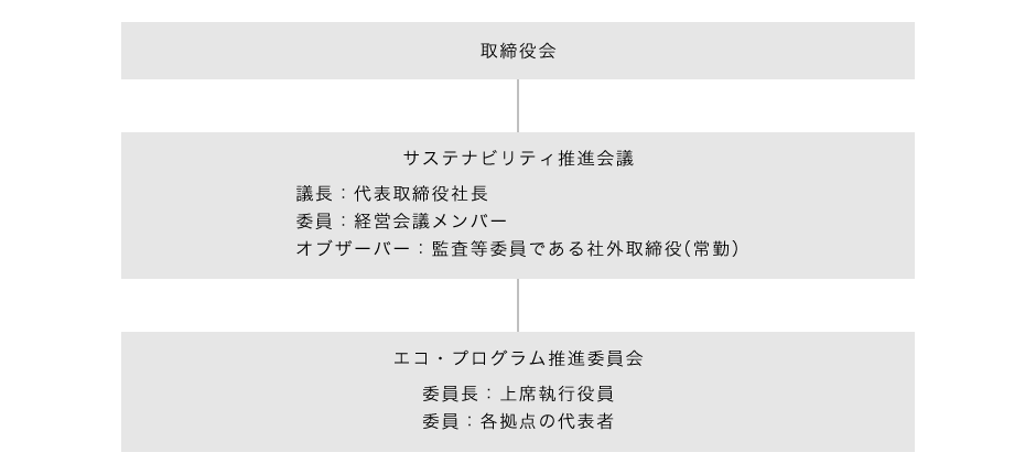 当社は、グループ全体のサステナビリティに関する取り組みを総合的に推進することを目的に、代表取締役社長を議長とし、傘下に関連する委員会を配置する「サステナビリティ推進会議」(以下、本会議)を設置し、本会議の運営を通して、グループ全体のサステナビリティに関する重要課題の検討・抽出、課題への対応方針の決定、進捗状況のモニタリングを推進しています。